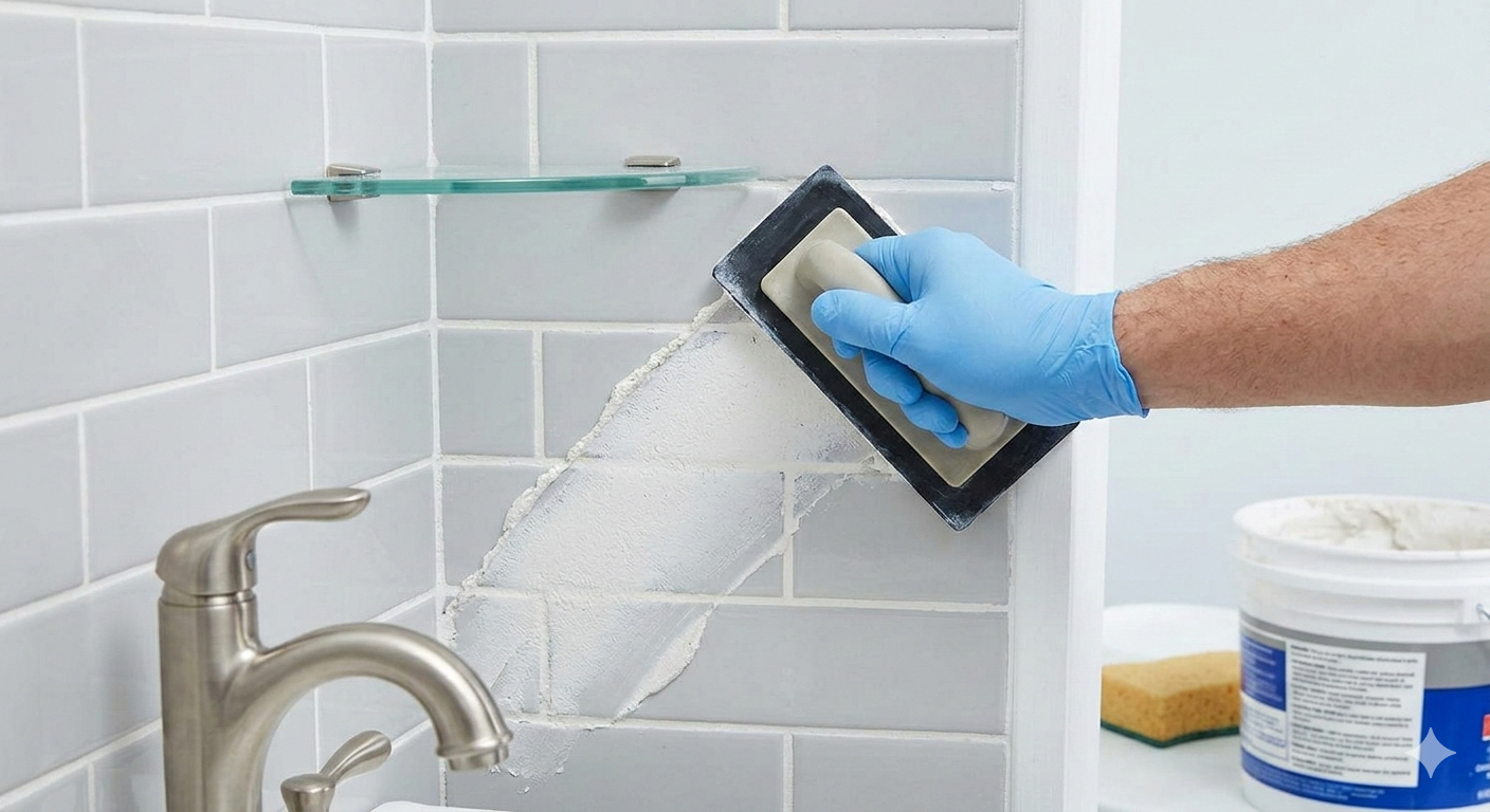 (Image: A close-up view of seamless execution. A gloved hand uses a rubber float to apply fresh grout into subway tile joints, defining the clean geometry that makes kitchen and bathroom tiling so satisfying.